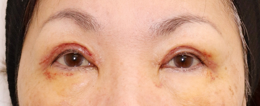 術後、この患者様の様に眉毛の位置が下がってくることがあります。写真は術後1か月の状態です。その場合、3ヶ月程度待って追加で余剰皮膚切除を行うことがあります。