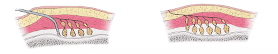 まず針先を骨に当ててから脂肪を注入しつつ針を後退させる。